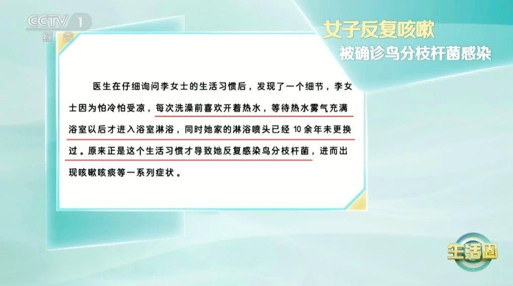 李女士眷恋时因怕冷怕受凉,是以每次眷恋前心爱开着沸水,恭候沸水雾气充满浴室以后才插足浴室淋浴,同期她家的淋浴喷头依然10余年未更换过,后果导致她反复感染鸟分枝杆菌,进而出现咳嗽咳痰等一系列症状。